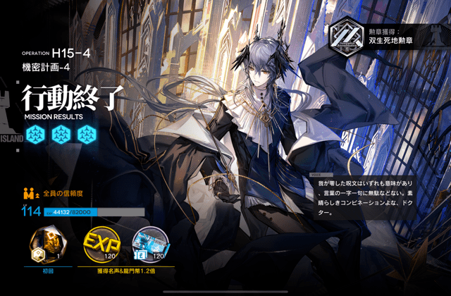 H難易度を攻略したんですが、まぁ……二度とやりたくないな……。ちょうどお衣装買ったロゴス先生がリザルトだったのでパチリと。ロゴス先生はS3で上3列の敵をずっと面倒見てました。下はウィシャデルとアスカロンさん。イネス血テキが遊撃で回復は後ろに純エイヤとシュウサリア任せ。ボスの削りが壊死組で2回。1回目のボスのダウンからの敵襲でアスカロンさんが倒されて下が瓦解してたので後ろの方にいた純エイヤを、初めてS3で起用しましたね。特化してないけど。そんな感じです。ウルピがいるといいって聞くけど、うちにウルピはまだいない!!!