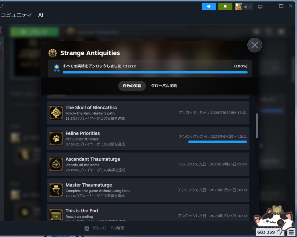 Strange Antiquitiesを完全クリアしました! 28時間です。 右にいるのは可愛いbongo catだよ。Jupiterも可愛かったよね^^